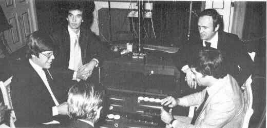 | Figure 3. Paul Magriel (left) plays Joe Dwek for $28,500 (winner-take-all) money style match held in Greece in 1977. Roger Low (left rear) was Magriel's consulting partner while Kumar Mothakasses (right rear) served in a similar capacity for Dwek. Magriel and Low won by the score 63-61. (From Backgammon Guide, Winter 1978.) | ||