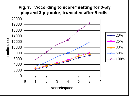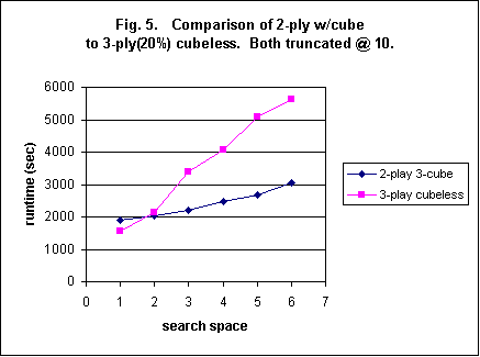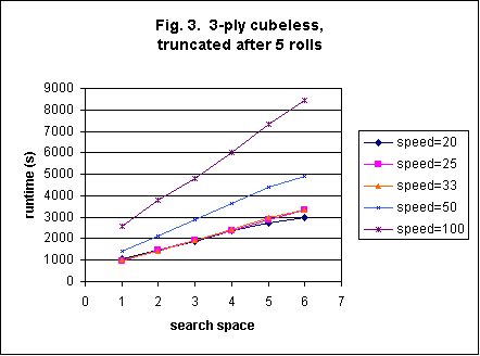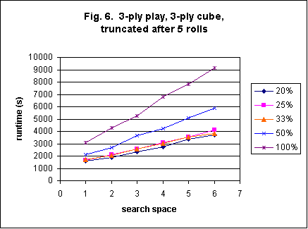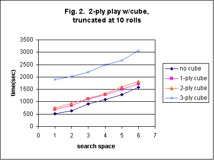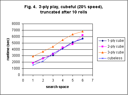 Figure 4 illustrates the effect of adding the cube to 3-ply (20% speed) rollouts truncated after 10 dicerolls. As was seen with 2-ply play, the cube only adds overhead when it is used at 3-ply. Even cubeless runs no faster than a 2-ply cube when 3-ply play is implemented. As was also noted for 2-ply, the introduction of a 3-ply cube adds a constant time increase, independent of searchspace.