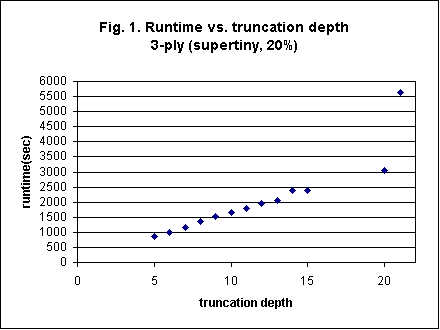 Figure 1 shows the effect of truncation depth. The data represented here were taken at the 3-ply level without cube. The searchspace and speed parameters were set at their minimum values (supertiny, 20%). The truncation value was varied from 5 to 15 (rolls) in increments of 1. Two more truncation settings -- 20 and untruncated -- were also tested. On the plot, the rightmost (high) point is the untruncated result. A nice linear relationship can be seen. This makes sense. If you require Snowie to toss twice as many dicerolls before truncating (evaluating), it takes twice as long. It can also be seen that the untruncated datapoint represents about 35 dicerolls (before reaching the bearoff database).